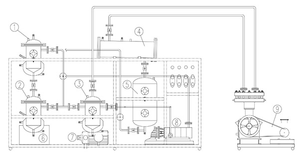 1-萃取罐,2-浓缩罐,3-缓冲罐,4-冷凝器,5-助剂周转罐,6-热水箱,7-热水泵,8-真空泵,9-压缩机