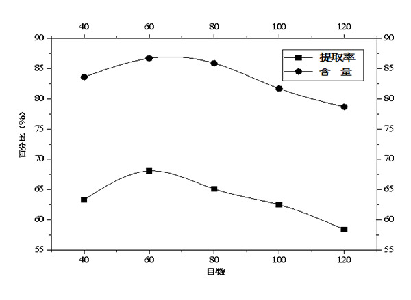 称取120目脱脂粉60g,加入蒸馏水配6.3%溶液进行1次酸提,此时溶液的pH在7.2附近,充分搅拌,用1mol/L盐酸溶液调节pH到4.2,泡沫稳定,达到等电点,于50℃下油浴1h,沉淀部分抽滤;取其滤饼加入蒸馏水配6.3%溶液复溶进行2次酸提,充分搅拌,再用1mol/L盐酸溶液调节pH到4.2,于50℃下油浴1h,沉淀部分抽滤;取其滤饼加入蒸馏水配11.1%溶液复溶,充分搅拌;用1mol/L氢氧化钠溶液调节pH至中性,于50℃下油浴一段时间,抽滤取其滤饼,滤饼置于50℃干燥箱中12h,得到粗火麻仁蛋白。100、80、60、40目的火麻仁蛋白分别采用以上方法得到,分别称量并按照1-1方法计算出提取率。
